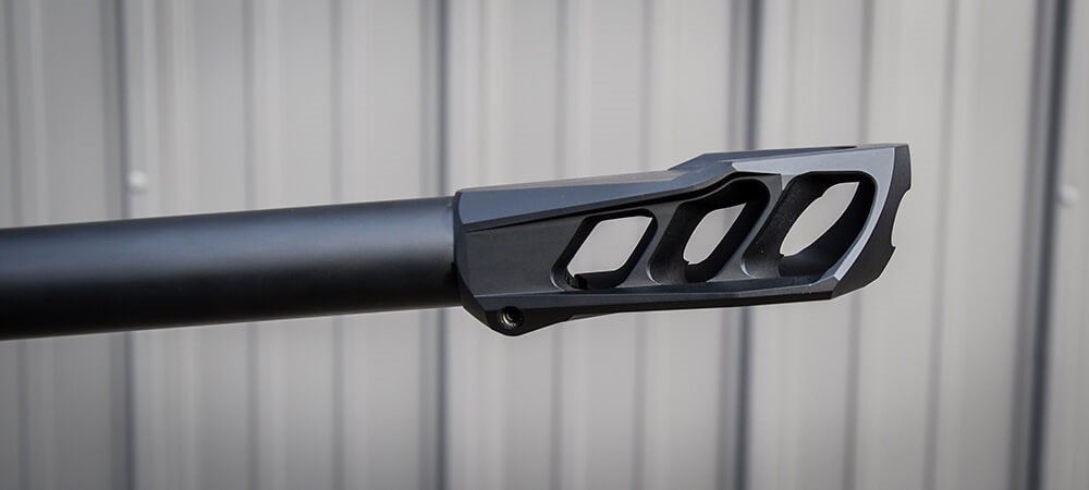 Le frein de bouche Cadex MX1 est conçu pour dévier le souffle de la bouche du tireur et de son observateur. Les gaz sortent latéralement et vers le haut pour réduire le recul ressenti et les nuages de poussière et améliorer le contrôle de la carabine. Il adoucira le recul de votre 338 Lapua comme s'il s'agissait d'un 243 Win. Conception à synchronisation automatique utilisant un boulon de pincement.