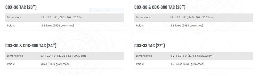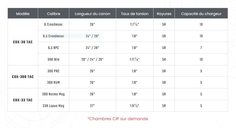 Les carabines de précision CDX-30 TAC, CDX-300 TAC et CDX-33 TAC sont des solutions économiques pour les forces de l'ordre ou le marché civil qui ne voient pas l'avantage d'un mécanisme de crosse repliable. La même fiabilité et la même précision sont combinées dans un ensemble éprouvé à une fraction du coût.
