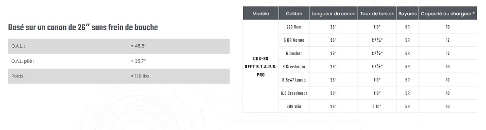 La CDX-SS SEVEN S.T.A.R.S. PRO est la dernière née de notre gamme croissante de produits destinés au tir PRS. C'est la carabine ultime pour les tireurs professionnels qui visent le championnat, ainsi que pour les amateurs persévérants qui rêvent de podiums lors de matchs régionaux. La CDX-SS PRO combine l'action SEVEN S.T.A.R.S. (Sport and Tactical Application Rifle System) avec le châssis STRIKE PRO et le légendaire canon Bartlein® 5R single-point cut technology. La CDX-SS SEVEN S.T.A.R.S. PRO offre une précision étonnante et est doté de toutes les caractéristiques nécessaires pour les jeux de tir positionnels où chaque seconde compte.