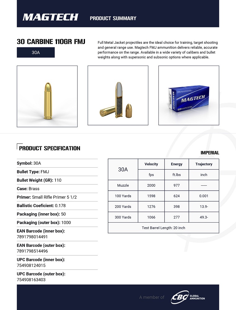 CARTOUCHES MAGTECH 30 CARBINE 110GR FMJ 30A+
