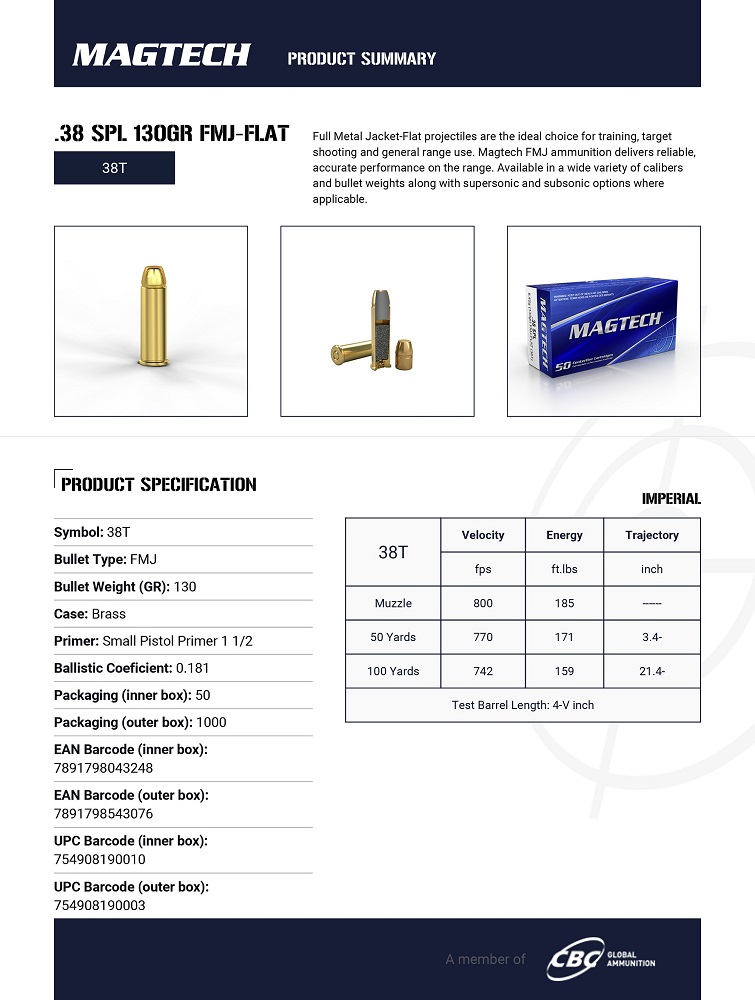 CARTOUCHES MAGTECH 38 SPL 130GR FMJ FLAT 38T*+