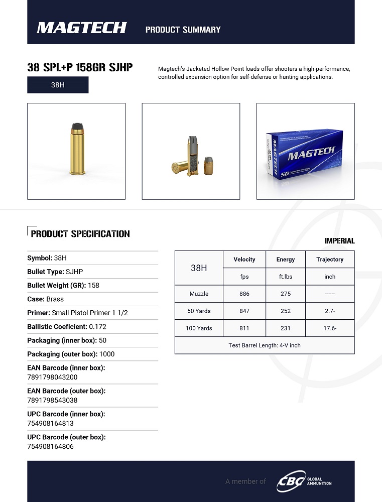 CARTOUCHES MAGTECH 38SPL +P 158GR SJHP 38H*+