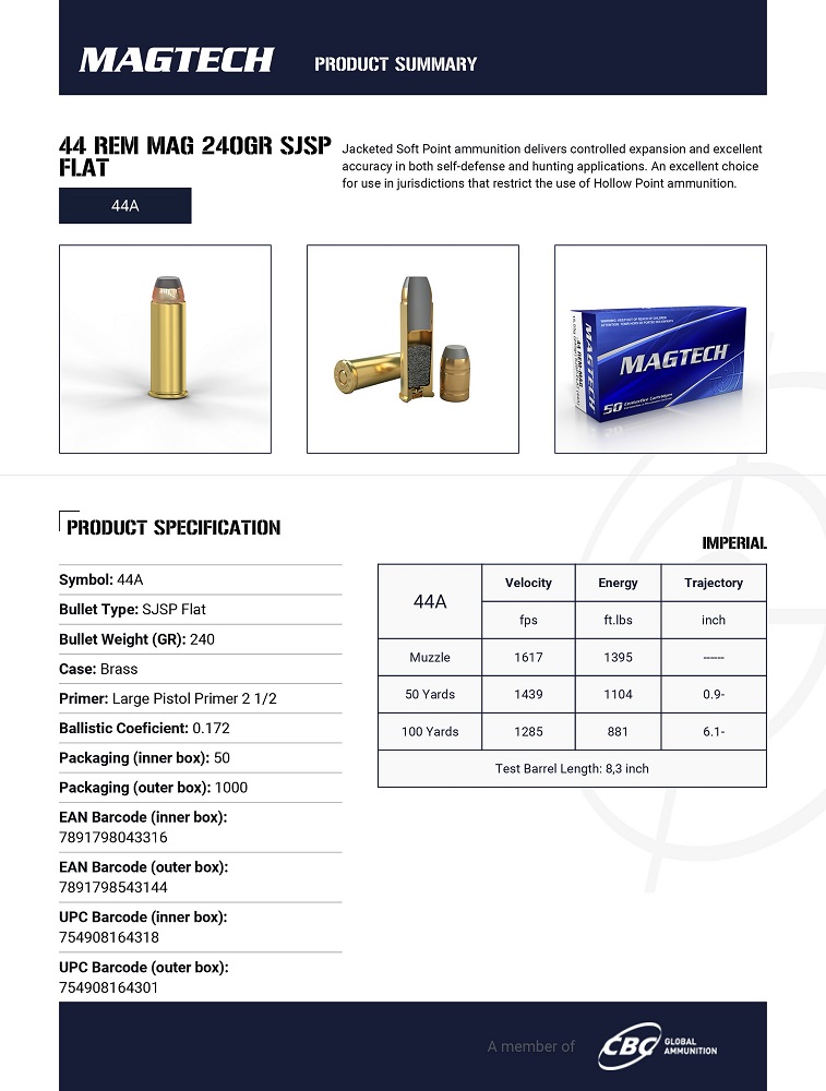 CARTOUCHES MAGTECH 44 REM MAG 240GR SJSP FLAT 44A PRIX SPECIAL+