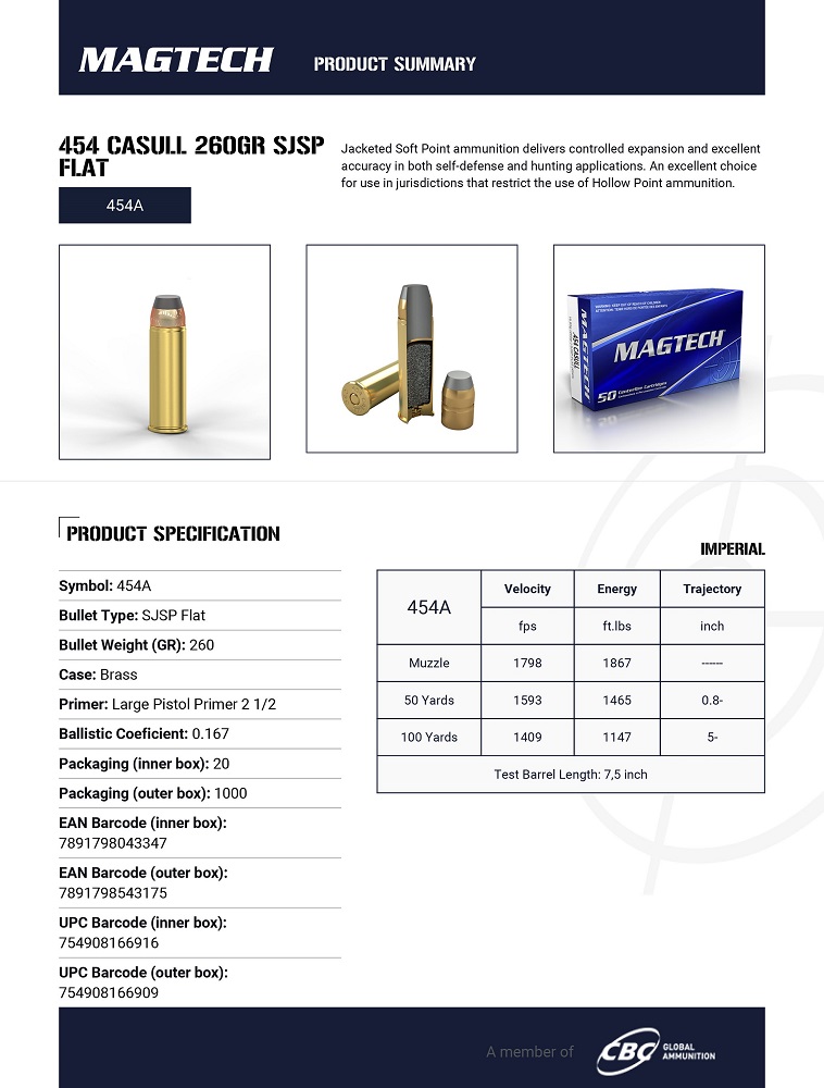 CARTOUCHES MAGTECH 454 CASULL 260GR SJSP FLAT 454A*+