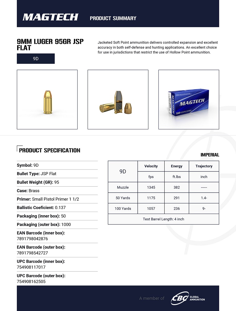 CARTOUCHES MAGTECH 9MM LUGER 95GR JSP FLAT 9D*+