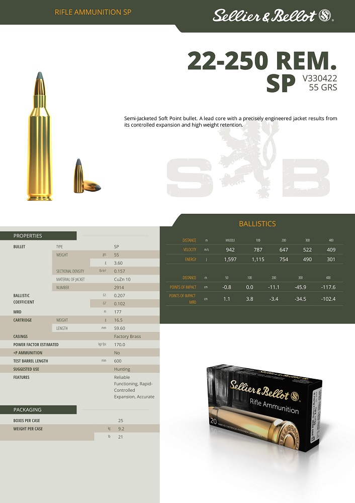 CARTOUCHES SB 22-250 REM SP 55GRS/3.6G