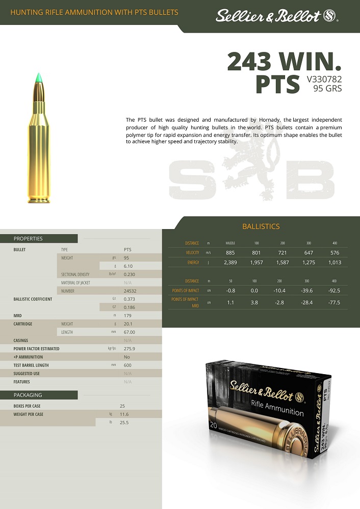 Cartouches Sellier & Bellot Polymer Tip Special. Les balles PTS contiennent un embout en polymère de première qualité pour une expansion rapide et un transfert d'énergie. Sa forme optimale lui permet d'accroître sa vitesse et sa stabilité de trajectoire.