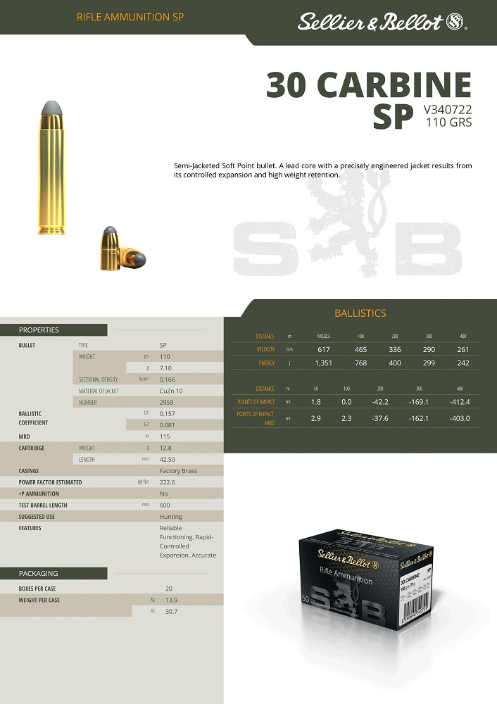 CARTOUCHES SB 30 CARBINE SP 110GRS 7.1G 340722