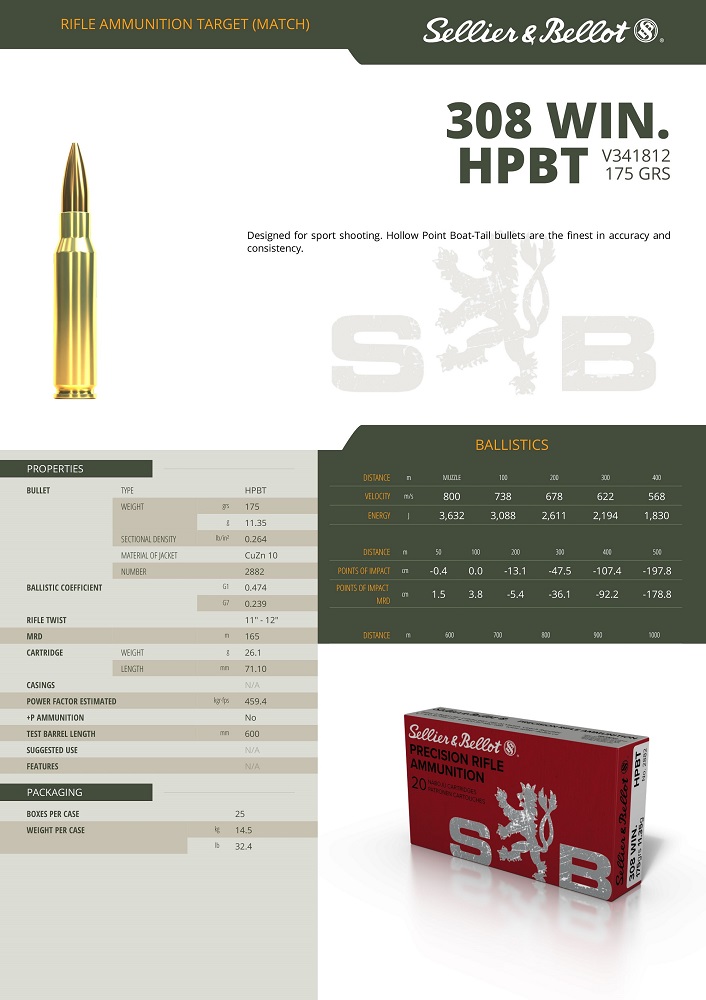 CARTOUCHES SB 308WIN HPBT 175grs/11,35g V341812