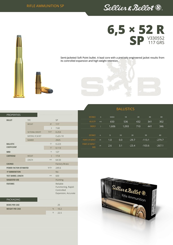 Cartouches Sellier & Bellot Semi-Jacketed Soft Point Bullet. Une munition classique plomb combinant une expansion fiable et un pouvoir d'arrêt important.