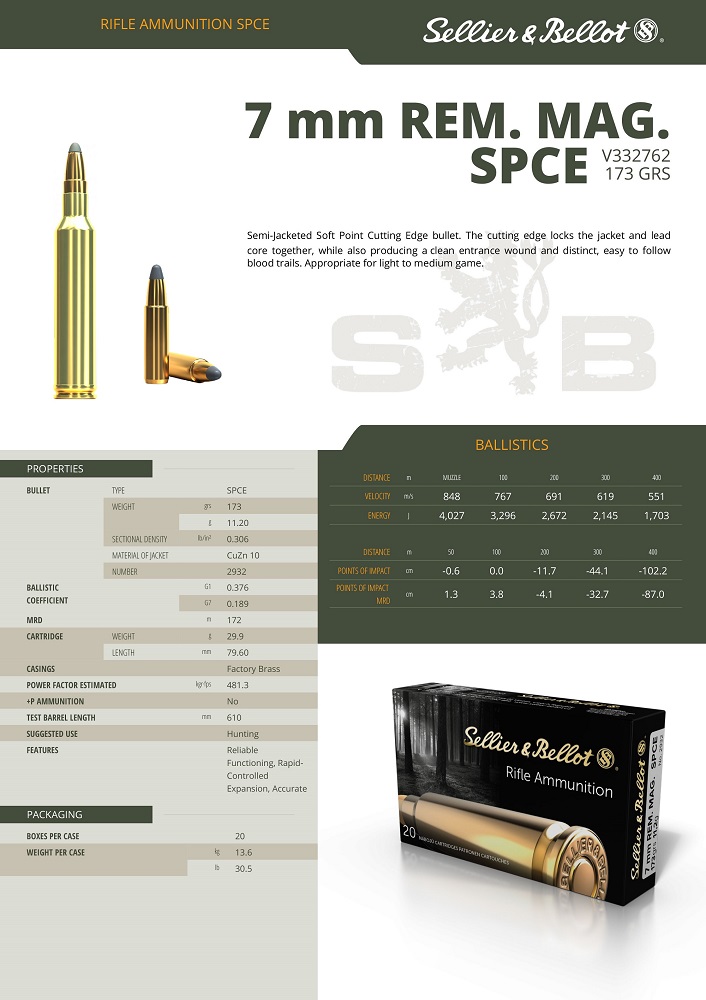 Cartouches Sellier & Bellot Semi-Jacketed Soft Point Cutting Edge Bullet. Pointe large en plomb pour une expansion rapide et importante.