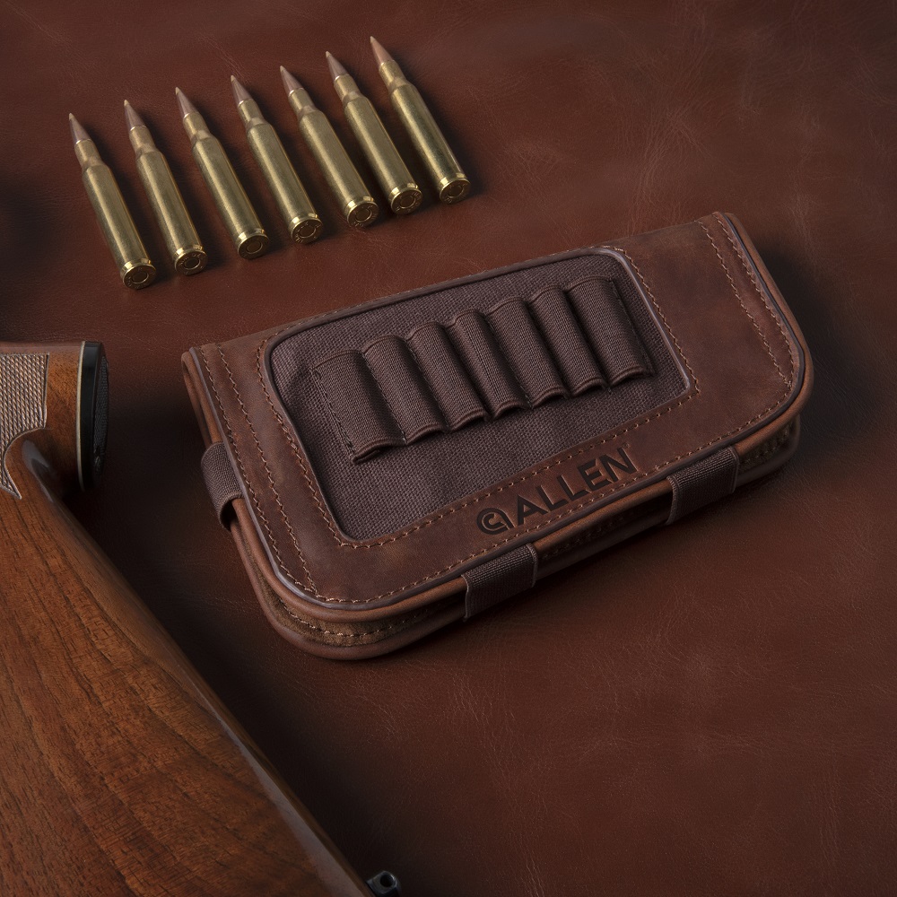 Cartouchière de crosse cuir Marron. Matériau en cuir, doublure collante pour réduire le glissement, rend l'arme plus confortable, fixation Easy Snap, peut contenir sept cartouches de fusil.