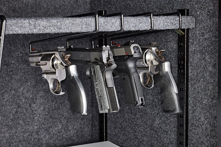 Le revêtement PVC permet d’y suspendre des armes de poing lourdes (calibre .22 et plus gros). Le crochet se glisse sur une étagère de 1,8 à 2,5 cm d’épaisseur.