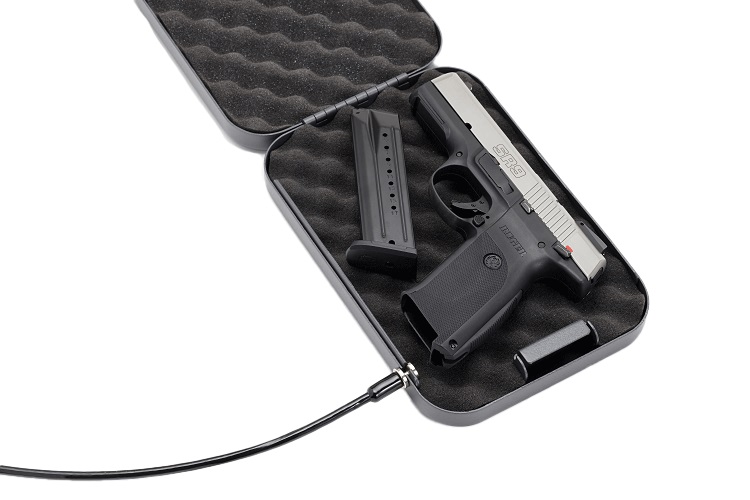 Contient un coffre, deux clés rondes, et un câble de sécurité. Peut contenir 2 pistolets type 1911 et révolvers à canon de 4 pouces (10 cm).