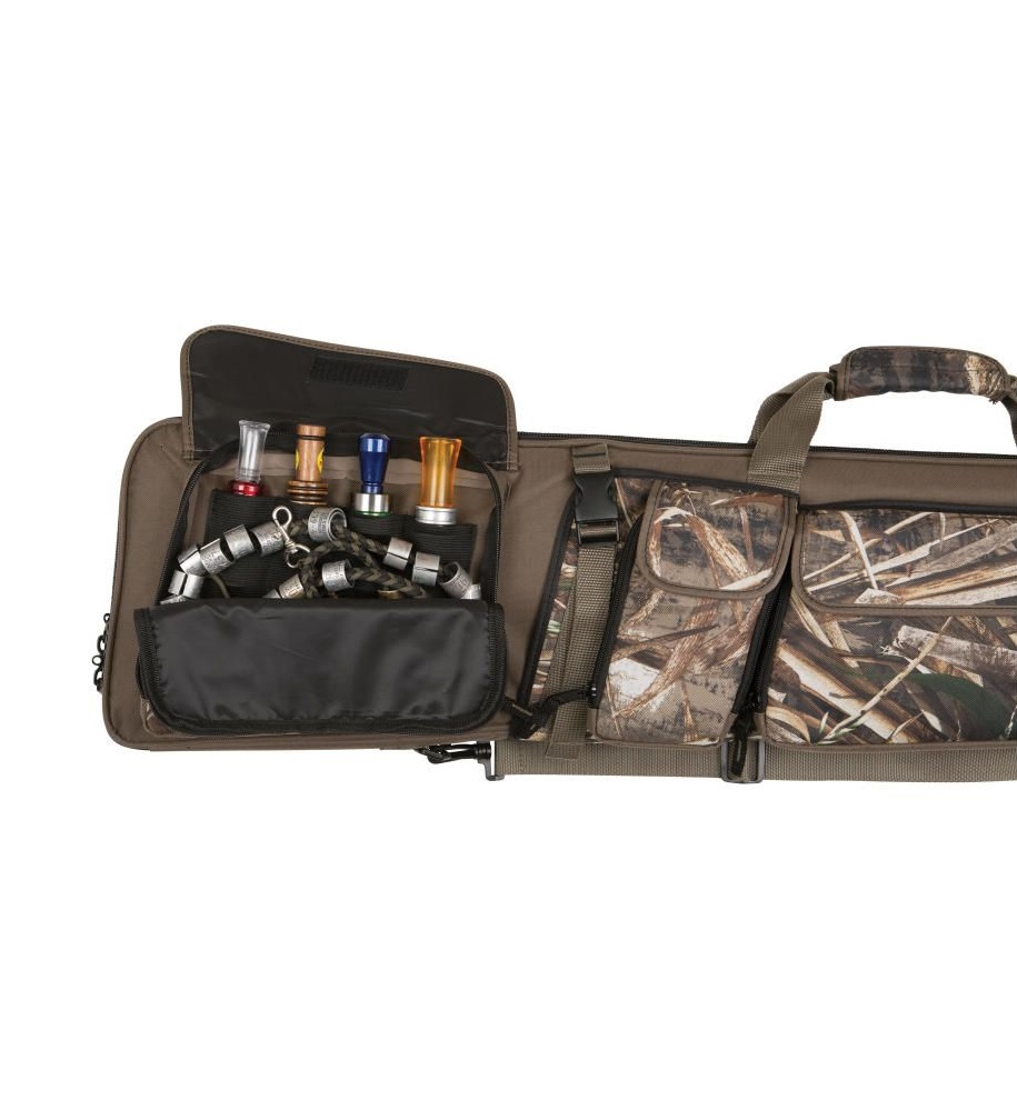 Mallette pour fusil à pompe Gear Fit Pursuit™ Punisher™. Orientée vers un but précis et conçue pour que vous puissiez emporter tous vos essentiels de la chasse au gibier d'eau, des appeaux en passant par le matériel de dressage des chiens et plus encore. Fabriquée en camouflage Realtree® MAX-5™, la mallette s'adapte aux fusils de chasse jusqu'à 52 pouces et comporte deux rabats de rangement de matériel et trois poches à fermeture éclair conçues pour ce que vous apportez à la chasse. La poche principale avant est dotée d'une poche de rangement étanche, de quatre grandes boucles élastiques et d'une poche extensible pour ranger les objets plus volumineux. Cet étui est également doté des sangles innovantes Gear Fit™ à connexion rapide, qui vous permettent d'emporter des articles volumineux, comme votre veste ou votre gilet pour chien. L'intérieur de l'étui est doté d'une mousse double densité très résistante pour une protection ultime. La doublure est facile à nettoyer, et les fermetures éclair surdimensionnées facilitent l'ouverture et la fermeture. Comprend une bandoulière détachable et réglable. La mallette Gear Fit Pursuit™ Punisher™ Shotgun est très résistante à l'eau et peut flotter pendant une durée limitée avec une arme et une quantité appropriée d'équipements rangés correctement dans la mallette. Elle ne doit pas être utilisée comme un dispositif de flottaison, veuillez faire preuve de prudence et de sécurité lorsque vous chassez près de l'eau.