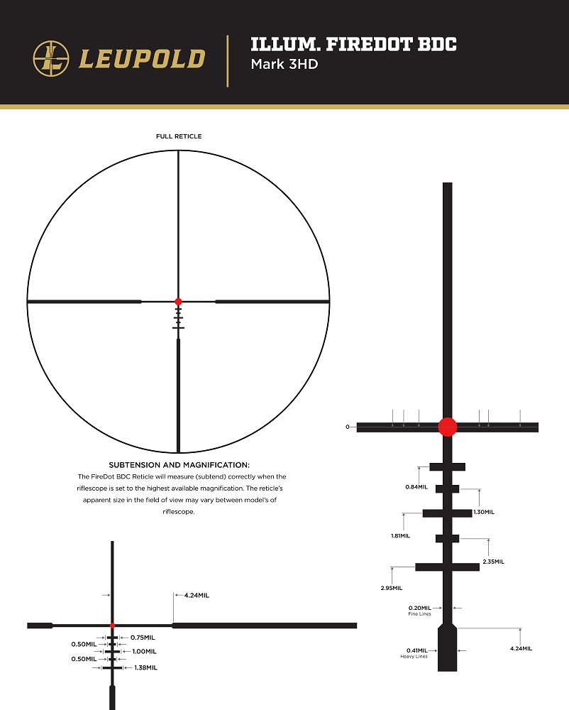 (Modèle Second plan focal/ Plage d'élévation 165 MOA/ Réglage de la dérive 165 MOA/ Réticule illuminé FireDot BDC)