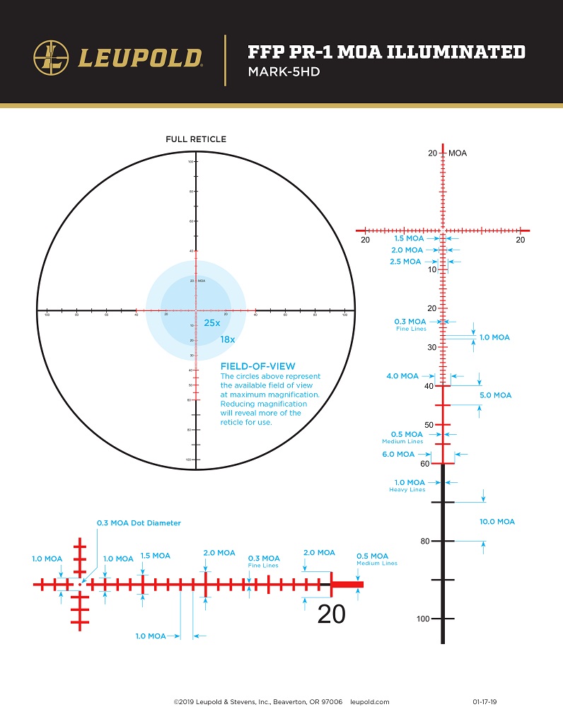 (Modèle Premier plan focal/ Plage d'élévation 125 MOA/ Réglage de la dérive 65 MOA/ Réticule PR1-MOA)