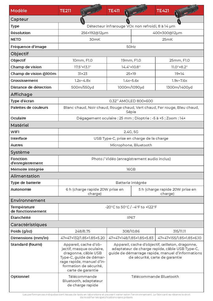 La série TE de monoculaires thermiques portatifs est un véritable concentré de vision nocturne au format de poche, offrant des performances exceptionnelles à un prix abordable. Elle est équipée d’un capteur infrarouge haute sensibilité, proposant plusieurs résolutions et options d’objectifs afin de s’adapter à vos besoins variés dans différents environnements.