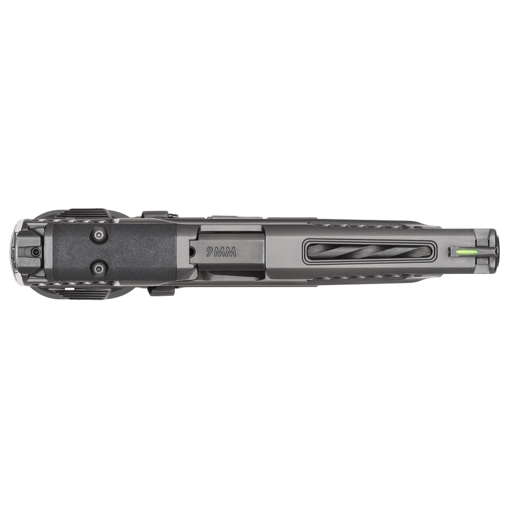 Canon de 5 pouces et carcasse entièrement en acier inoxydable avec cannelures hélicoïdales et finition Armornite®, pas de rayure 1:10" : la construction lourde réduit le recul ressenti pour des tirs de suivi plus rapides.