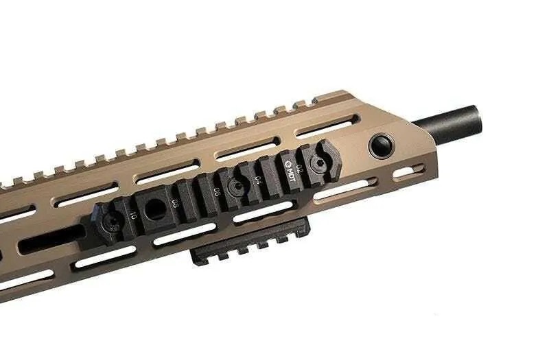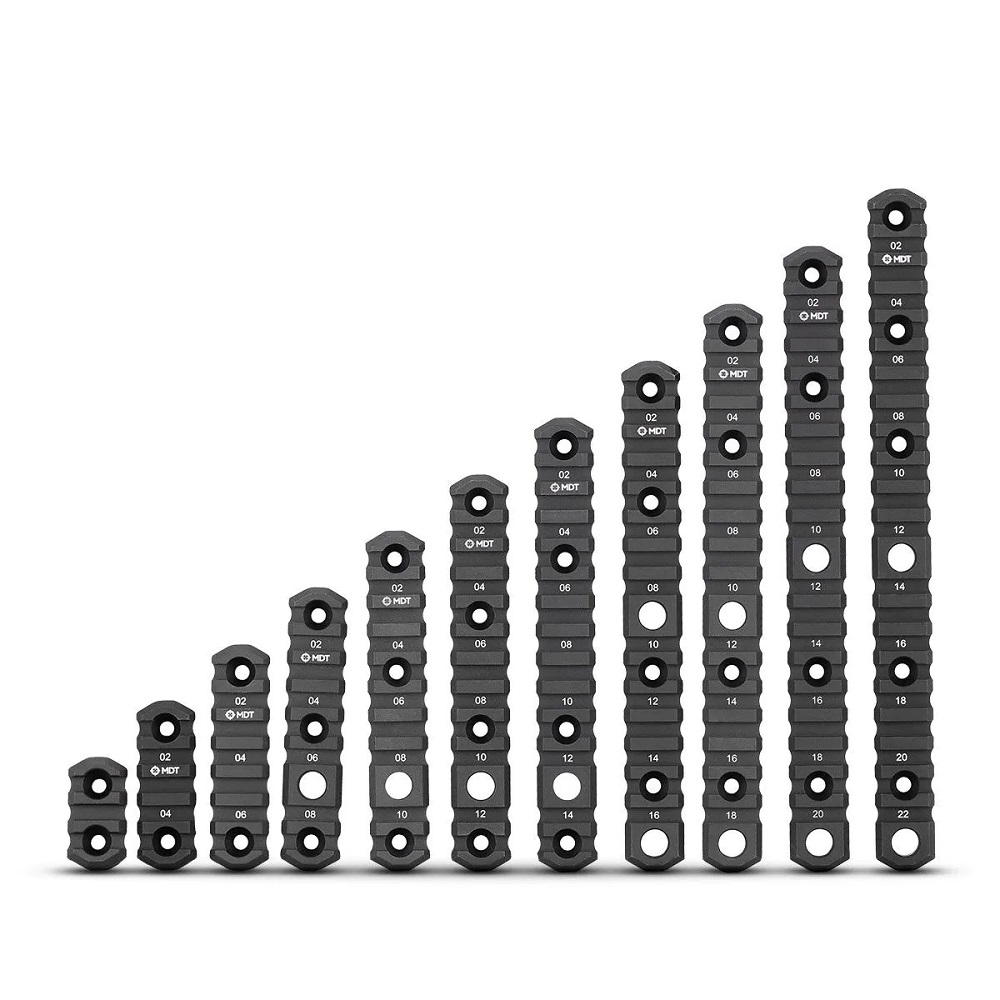 Les rails Picatinny M-LOK de MDT sont conçus pour être un ajout fiable aux systèmes de châssis MDT lors de l'installation de divers accessoires sur votre fusil à verrou. Ils sont usinés en aluminium 6061-T6, puis anodisés en noir dur pour une finition résistante. Ces rails sont également dotés de repères de position gravés au laser, facilitant les montages répétés. Disponibles en plusieurs longueurs, certains modèles intègrent un point d’attache rapide (QD flush cup) pour sangle. Ils sont livrés avec la visserie nécessaire pour le montage sur les systèmes compatibles M-LOK, déjà intégrés dans de nombreux châssis et garde-mains MDT.