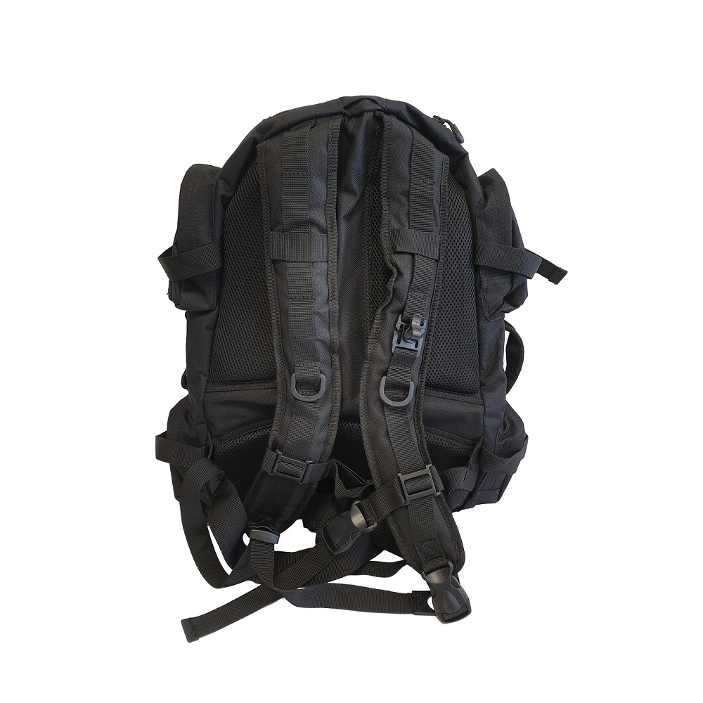 Extérieur : Sangle de poitrine avec double boucle de libération latérale. Sangle de taille réglable. Chaque côté a 2 poches d'accessoires à fermeture éclair et une sangle de transport latérale. Le fond a 3 rangées de sangles M.O.L.L.E pour plus de personnalisation. Poche extérieure profonde à rabat sur le devant avec ouverture à glissière. Grande poche extérieure à rabat sur le devant : 9" w x 11" I X 2" d.